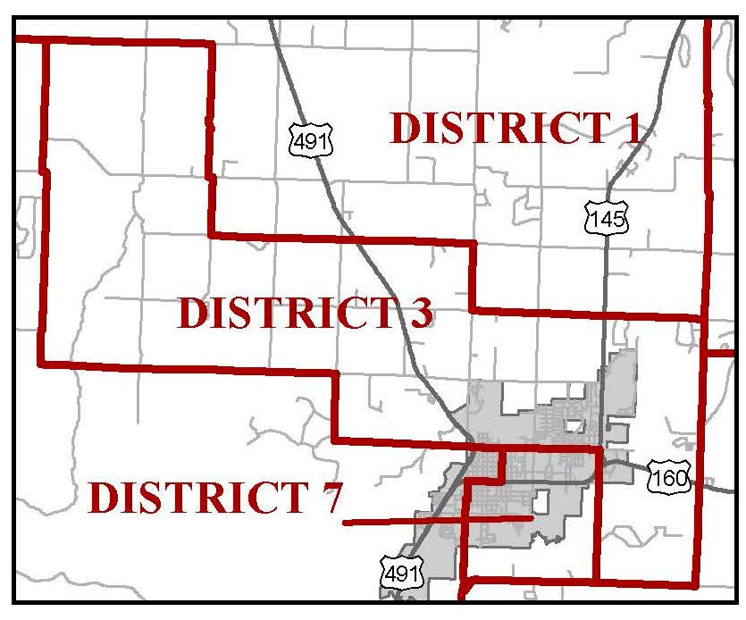 District 3 is generally described as follows: Generally, the center Montezuma County portion of the system. The eastern boundary begins at the midpoint of the southern edge of T36N R15W S32, and continues north along section mid-lines until it intersects Road M. The district boundary then follows Road M west until it intersects Road 25, then follows Road 25 north until it intersects Road N. The boundary then follows section lines (generally coincident with Road N) west to the intersection with Road 21, then follows Road 21 north to the intersection with Road S, and then follows Road S west to the intersection with Road 18. From there, the district boundary follows section mid-lines (generally coincident with Road 18) south to the northern edge of T36N R17W S22, and from there travels east along section lines (generally coincident with Road L) until it intersects with Road 23. From there it follows Road 23 south to the intersection with Road K. The boundary then follows Road K east to road’s end and continues east generally along section lines until it intersects with Empire St., and then it follows Empire St. east until it intersects Colorado State Highway 145. It then follows