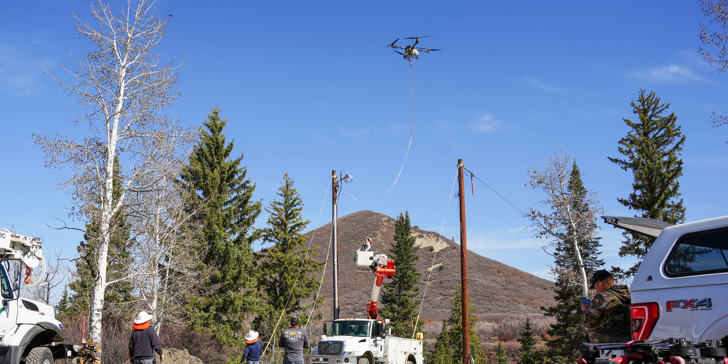 Grand Valley Power hired heavy-lift drones in 2025 to help carry lines across rugged terrain and a creek. The drones cost half of what it would have cost to hire a helicopter.