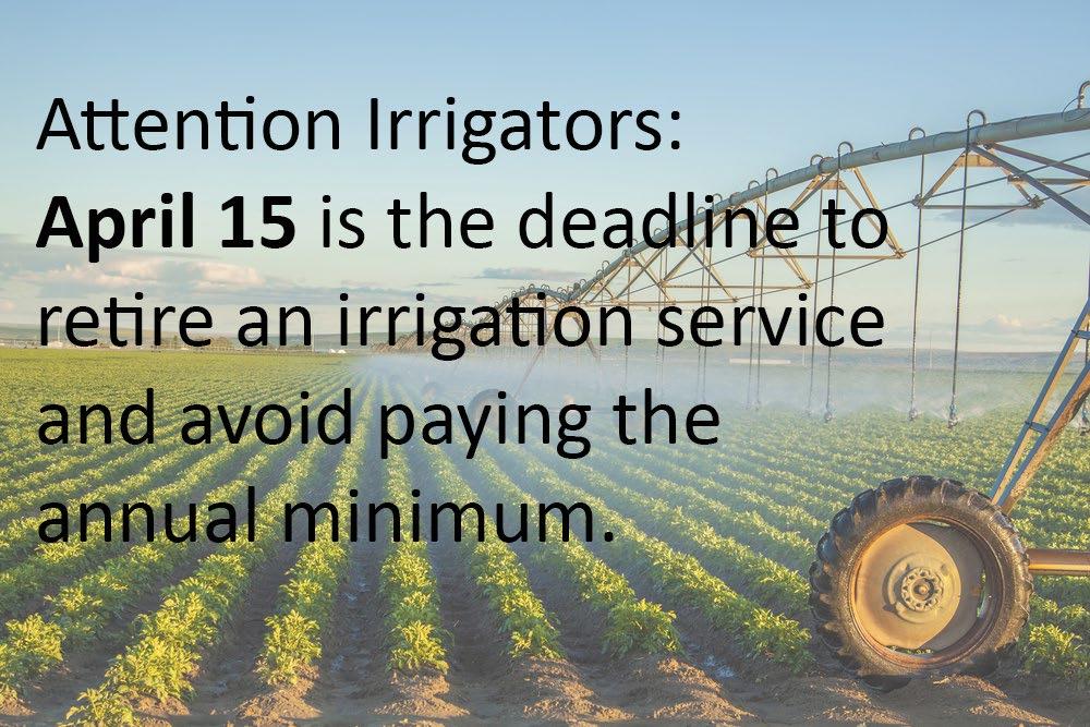 4. Irrigation accounts are always connected into the landowner’s name. The responsibility of payment for electric usage on the service is ultimately the landowners however bills can be mailed to one or both parties.