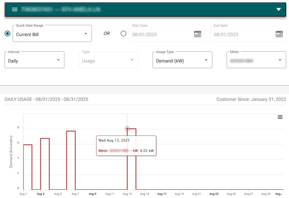 • Peak Demand (kW): This shows the highest amount of electricity your home used at one time during peak hours. This reading sets your demand charge. Peak hours are 5 p.m. to 9 p.m., Monday through Saturday.