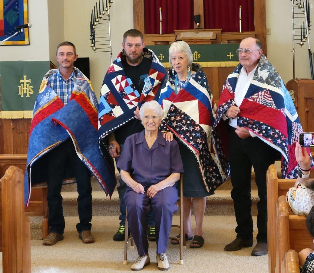 Gloria Peck (seated) from Eads presents four quilts she made for area U.S. Veterans (left to right) Tim Green, Mike Walsh, Areta Laird, and Roland Sorenson.