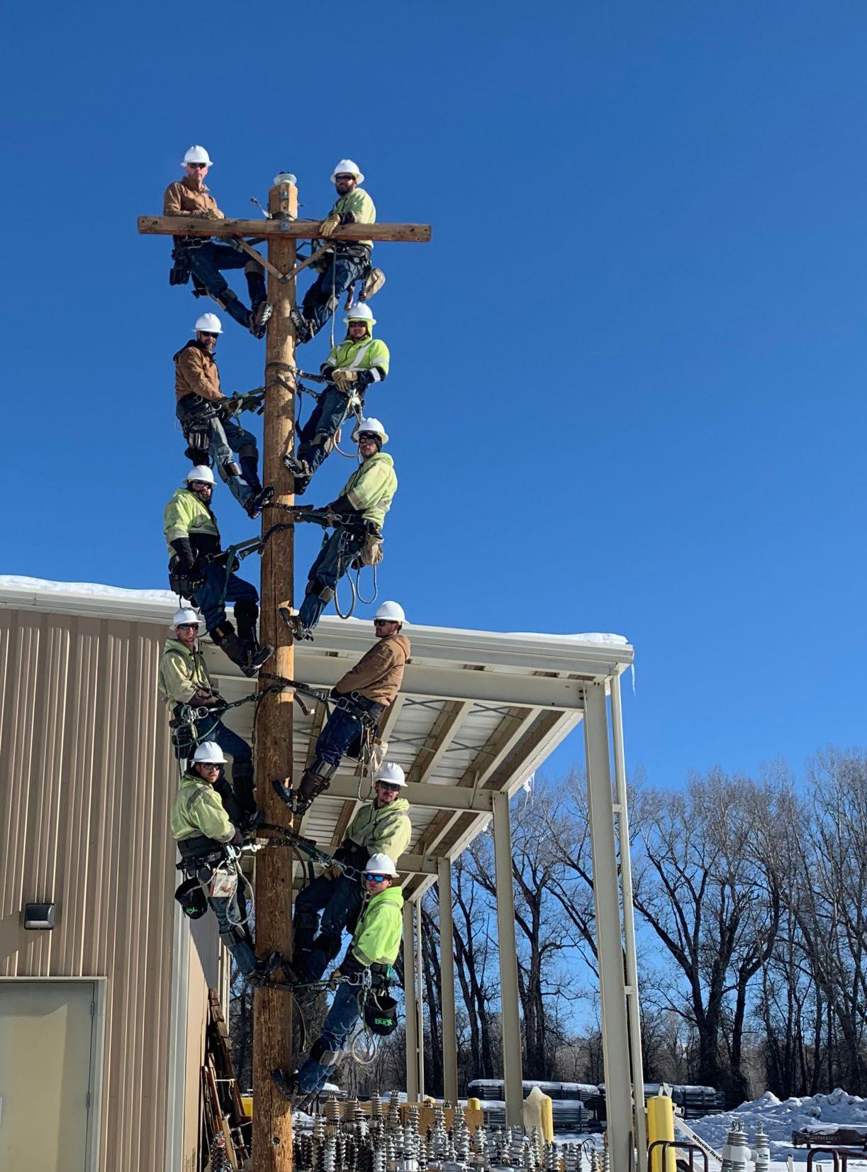 Photo at left: GCEA linemen work on poles and bring electricity to support the electrification effort on Navajo Nation.