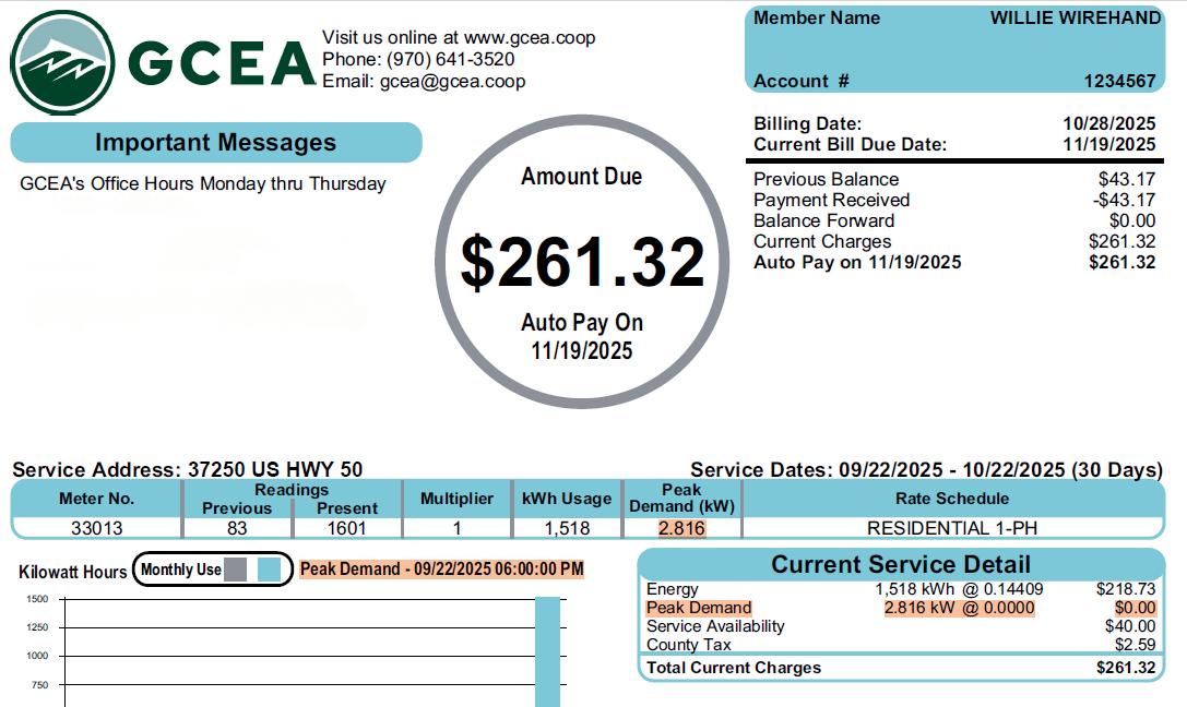 To help you prepare for GCEA’s upcoming rate change, your bill now displays your peak demand and the time it occurred, along with a new “Peak Demand Charge” line, which will remain $0.00 until January 2026.