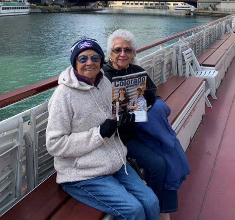WINNER: Sisters Bernice Garcia and Ida Martin ride the river boat with their copy of CCL in Chicago, Illinois. What a great way to see the city! Bernice and Ida are both consumer-members of San Isabel Electric Association.