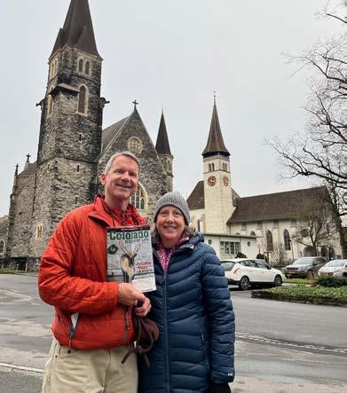 Mountain Parks Electric consumer-members, Matt and Amy Boyd, show off their copy of CCL while vacationing in Interlaken, Switzerland, with their daughters, Grace and Jane.
