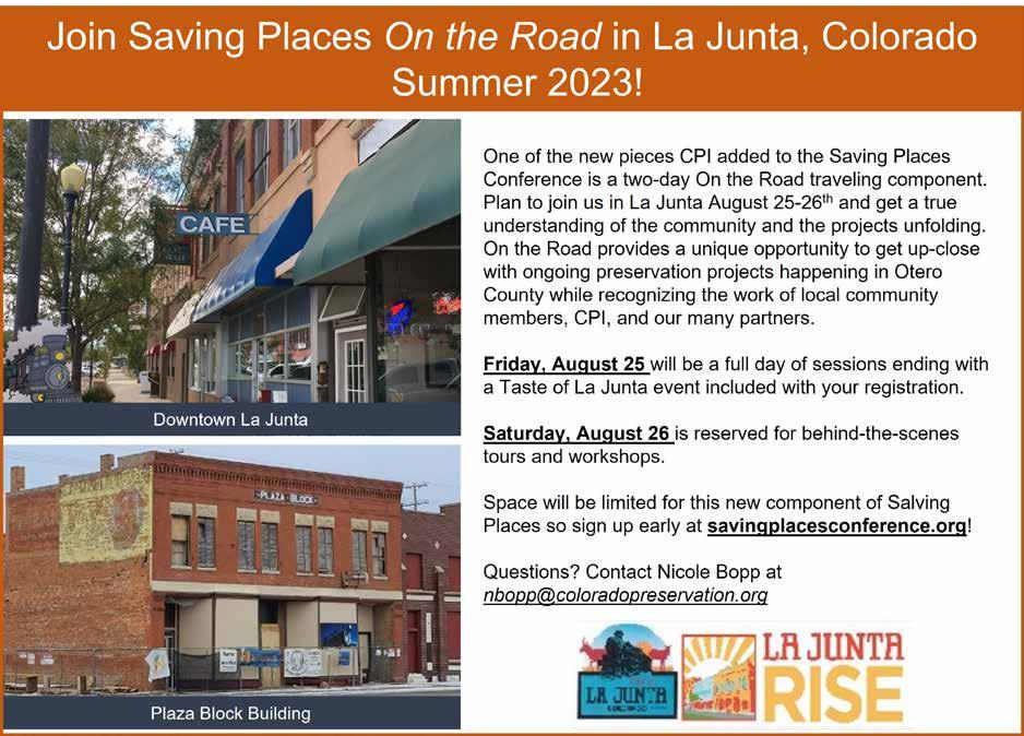 Join CPI and our sponsors On the Road as we head to the historic community of La Junta this summer. Attendees can expect four blocks of sessions on Friday before community networking and celebrating in historic downtown La Junta. Saturday, attendees will have access to unique behind-the-scenes access at ongoing preservation sites in the area. These tours will give a glimpse into the incredible work being done in Otero County with a focus on projects such as the Plaza Block Building and heritage landscapes of the county. Register early as space is limited for this new 2-day offering!