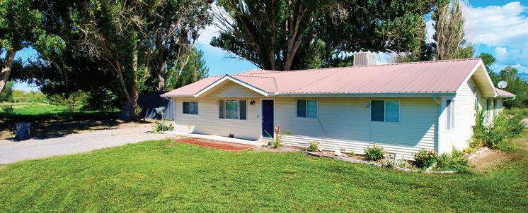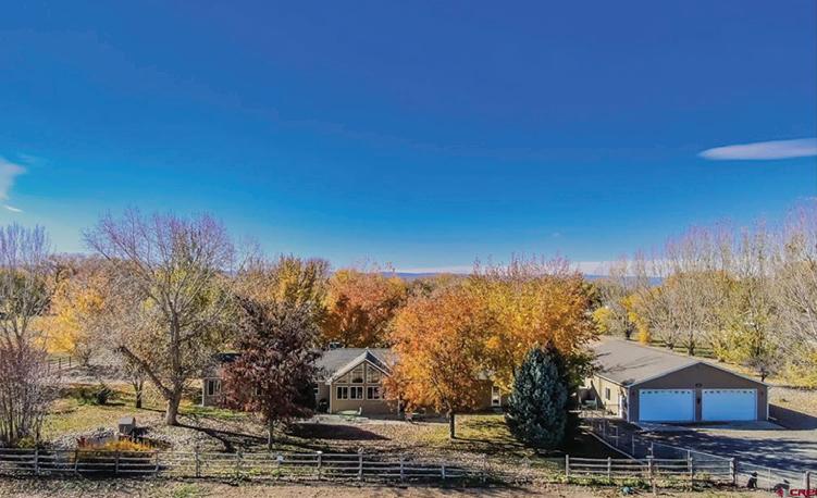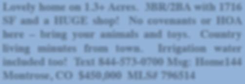 This ideal horse property is centrally located in a beautiful area west of Olathe and Montrose on 10 acres. With a large three-bay shop, horse fencing & irrigated acreage, and a beautiful country home with pressurized irrigation, professional landscaping, and RV parking, this property is wellsuited for the horse enthusiast, with close proximity to town. The home was built in 2007 with a thoughtful floor plan that covers 2,145 square feet, with 3 bedrooms and two bathrooms.The large shop building is 2,376 square feet with spray-foam insulation, has three (3) bays, and an office room for a workspace outside the home for those working from home. The property is a total of 10 acres, and comes with 8 shares of UVWUA water rights. MLS #798567 $849,000, Listed by: Jake Hubbell & Gary Hubbell - 970-250-9396