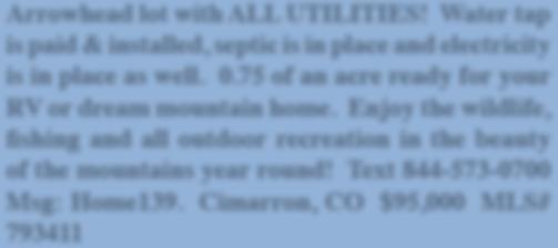 with great views, it’s an ideal building parcel. Permitted to have one building site with an Aspen Valley Land Trust conservation easement, there’s plenty of room for recreation, agricultural use, and a great building site. Property includes mineral rights with a small monthly royalty payment. Priced at $275,000 AGS MLS #172081 Call: Jake Hubbell 970-250-9396 COUNTRY BUILDING PARCEL FOR SALE HOTCHKISS,