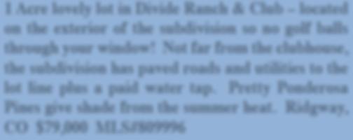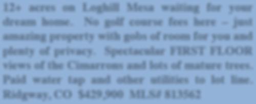 to frame the incredible mountain views. New kitchen appliances and stone countertops. Main-floor master wing with laundry. Enjoy sunsets from the wrap-around covered porch. Includes a 24 x 40 garage / shop building and utility shed. $639,000 #799862 Mike Jackson 970-234-4427 IT’S A BLANK CANVAS ready for you to paint your future upon. Watch the sun rise over the panoramic west elk mountains to the east. 400 shares of Fire Mountain Canal with gated pipe to irrigate a hay field or set up drip-lines to a vineyard, orchard, ortruck farm. The well is permitted for three homes, an acre of irrigation and stock water - when constructed in 2004, it produced 18 gpm from a depth of 127 feet. New construction is made simple in Delta County without the need for a building permit and there’s no building code. $399,000 #813067 Mike Jackson 970-234-4427 HOTCHKISS HOTCHKISS HOTCHKISS