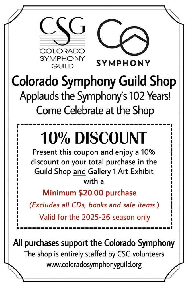 Whether it’s your first visit or your fiftieth, we want every moment at Boettcher Concert Hall to feel welcoming, inspiring, and unforgettable. Thank you for being part of the Colorado Symphony family.