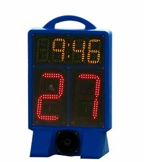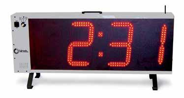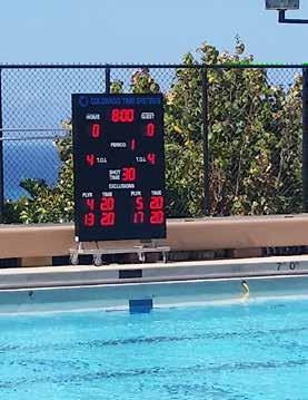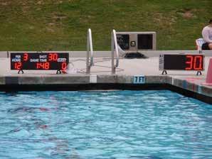 Water polo scoreboards integrate wirelessly with System 6 and wireless adapter, wireless handheld controller, or wireless tabletop controller. Option to run wired with System 6 timing console. Optional external horn.
