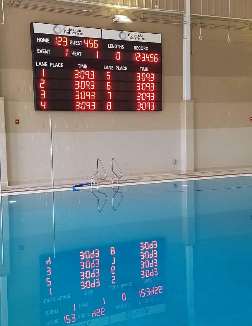 Eight lane + event/heat swimming scoreboard in same enclosure as a 10-lane, with space for signage above the data