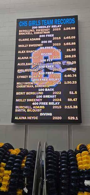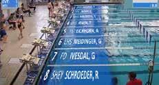 Six lane + event/heat swimming scoreboard in same enclosure as a 10-lane, with space for signage above and below the data