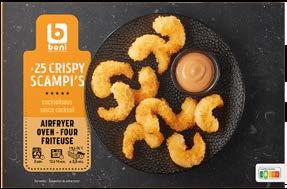 6 Bak intussen de scampi’s krokant (in de oven, airfryer of friteuse, baktijd: zie verpakking).
