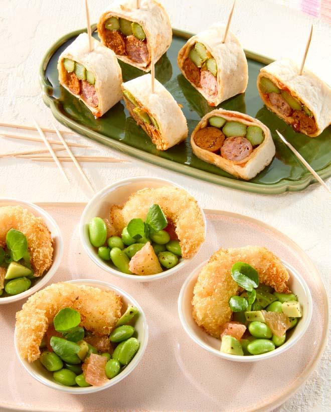 9 Rol de wraps strak op en snij in hapklare stukken. Steek vast met een prikker.