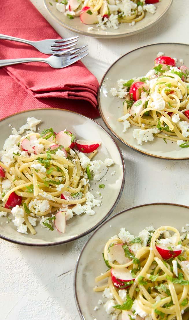 4 Verdeel de linguine over bordjes en verkruimel er de feta over. Werk af met wat munt.