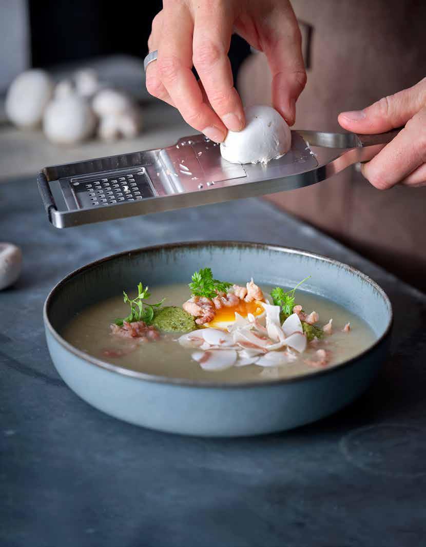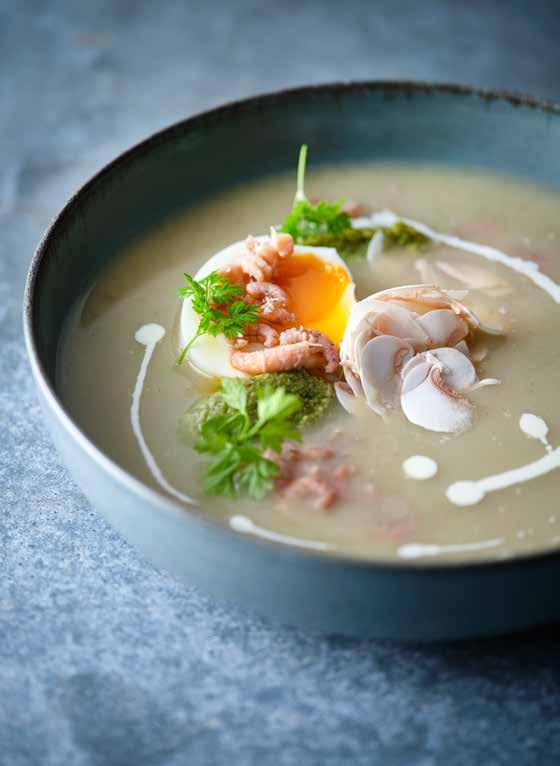 SOEP 73 Schorsenerensoep met zachtgekookt eitje, waterkerspesto, garnalen en champignons