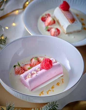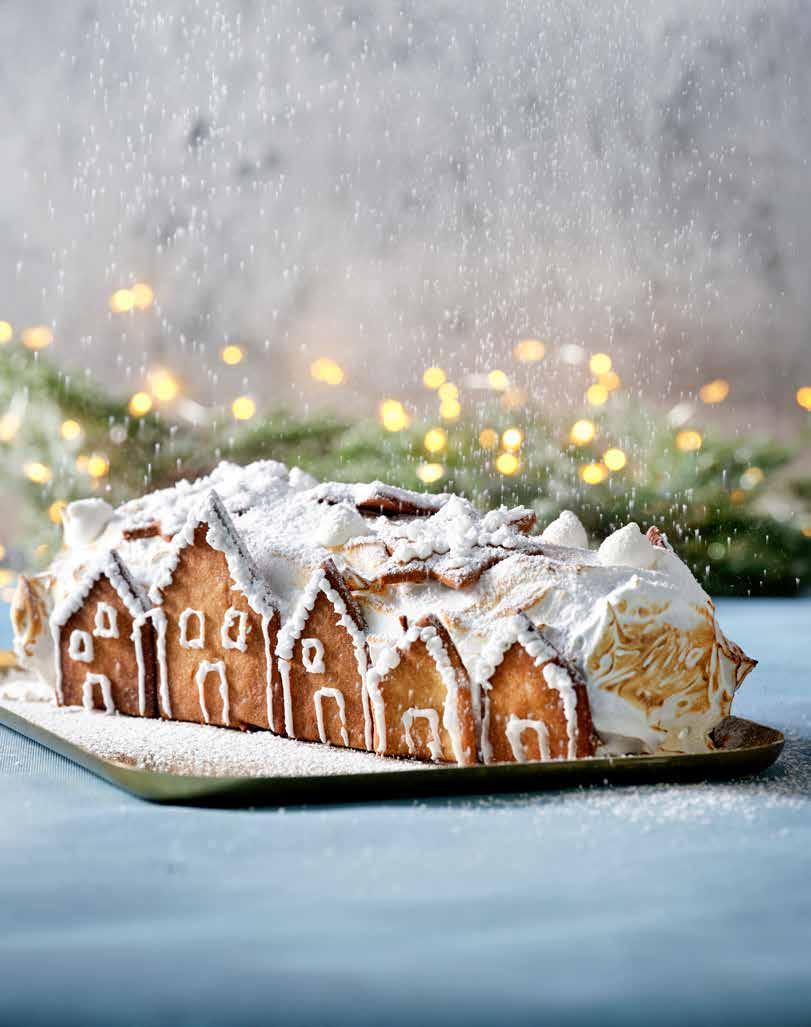 10. Haal de rolbiscuit uit de folie en leg op een schotel, bedek met de meringue en brand hier en daar af met de bunzen brander. Versier met de koekjes en wat minimeringues.