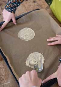 5. Leg twee hoopjes deeg op een ovenplaat met bakpapier. Smeer open met de achterkant van een lepel tot 2 cirkels van 10 cm.