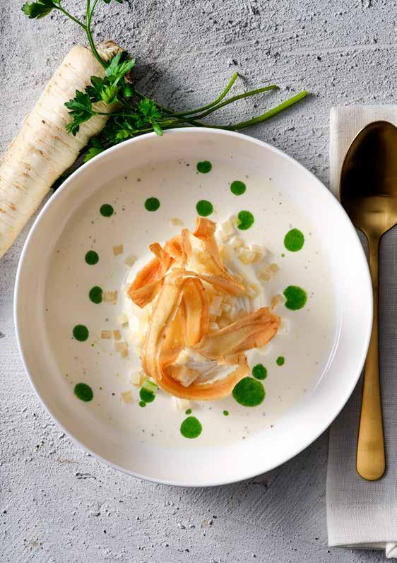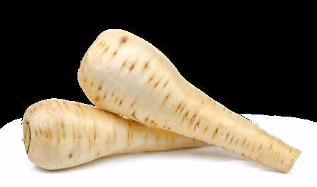 “Op het eerste gezicht zou je kunnen denken dat het een pastinaak is. Ze hebben dezelfde structuur, maar het zijn wel dege lijk twee verschillende groenten. De peterse liewortel is witter van kleur en ook kleiner dan de pastinaak. Zijn aparte, kruidige smaak doet denken aan knolselder, peterse lie en groene selder. Hij smaakt minder fel en minder zoet dan pastinaak.”