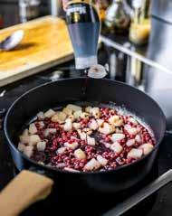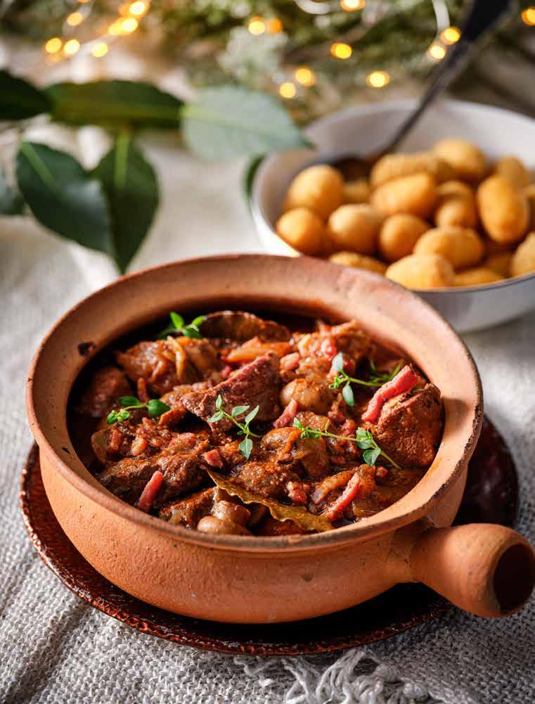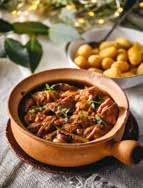 Dek de pot af en zet 30 min inde voorverwarmde oven.9. Haal het deksel eraf en roer deragout stevig door elkaar. Voegindien gewenst room toe en zet hetdeksel er half op.10. Zet nog u in in de oven zodatde saus kan inkoken en het vleesbotermals wordt. Kruid met peperen 11. Serveer met gefrituurde Pom’Pinsof kroketjes.