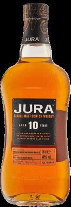 De ongewoon hoge destillatieketels van Jura single malt whisky 10Y (40%, 70 cl) zorgen voor zijn niet te evenaren puurheid. Denk aan overheerlijke donkere chocolade in de neus, nectarine in de mond en een afdronk met koffietoetsen.