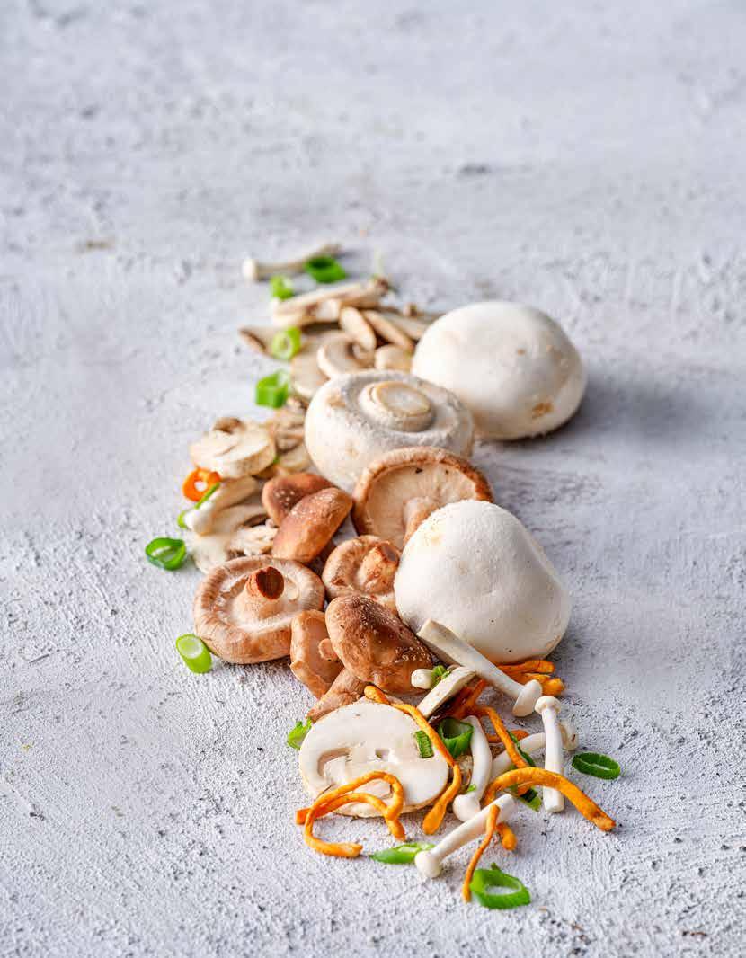1. Pel de uien en snij grof. Pel de looken snij in plakjes.2. Borstel de champignons schoonen snij de grote exemplarendoormidden.