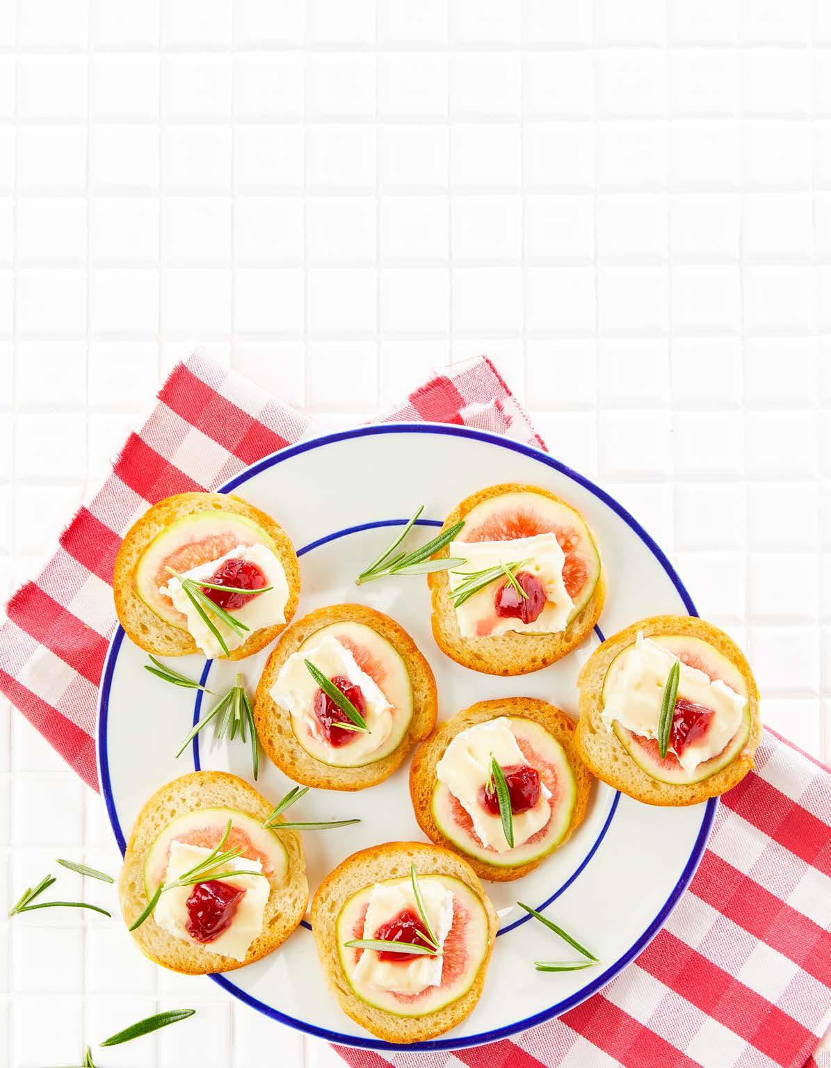 1 VERSE VIJG • 1 TAKJE ROZEMARIJN • 150 G CAMEMBERT 10 TUC BAKE ROLLS ZEEZOUT • 2 EL FRAMBOZENCONFITUUR
