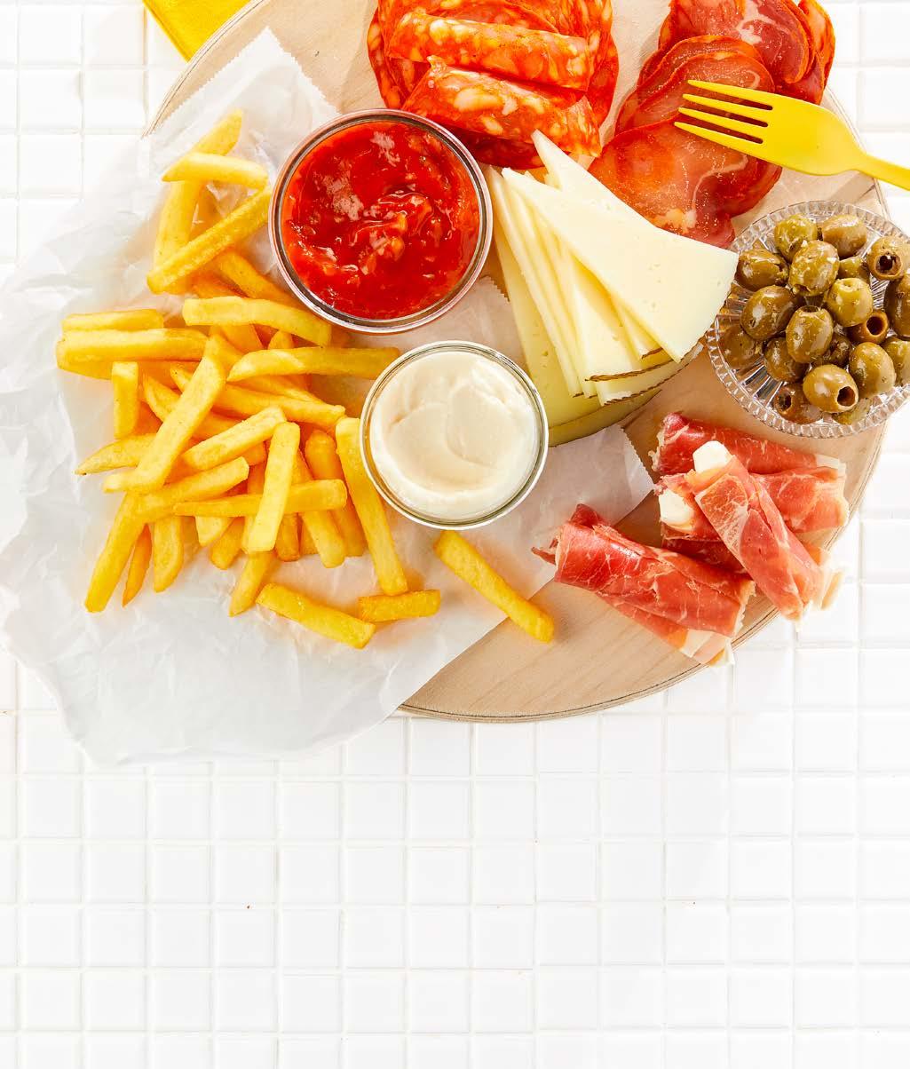 3 Serveer de frieten met de dipsaus en de aioli. 4 Schik op een ronde schotel samen met de olijven, driehoekjes manchego, sneetjes chorizo en lomo en de serrano met roomkaas.