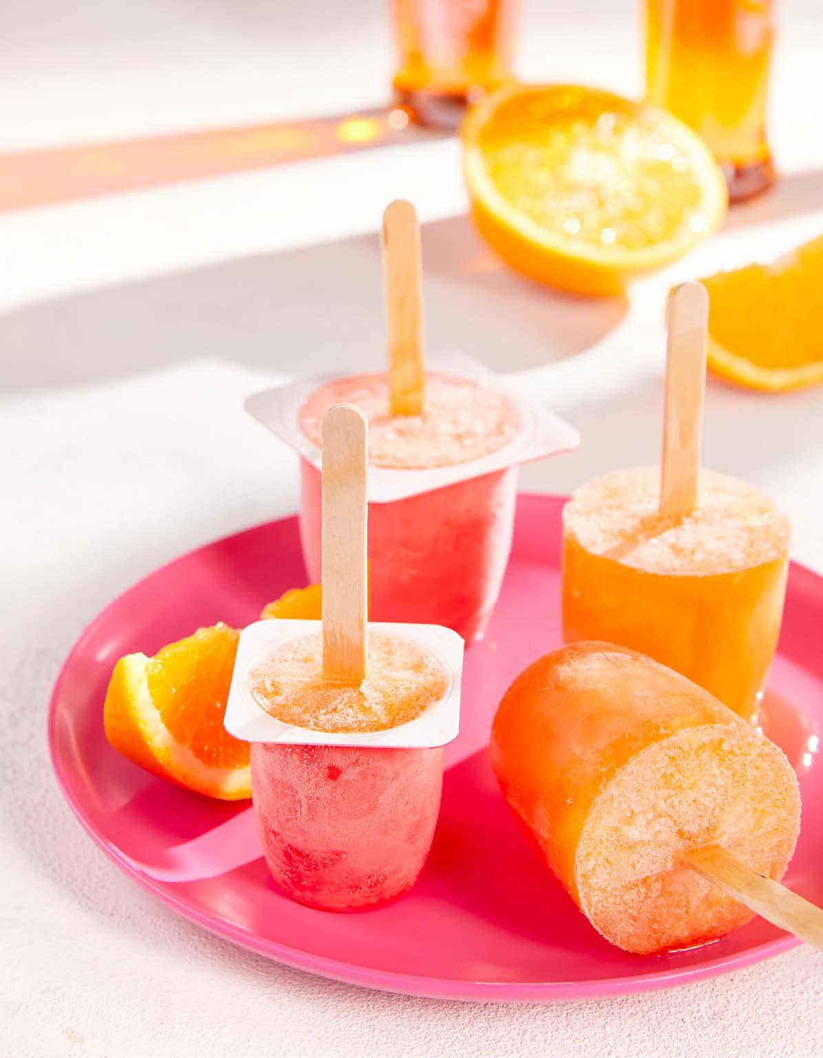 Giet je Aperol Spritz in een leeg yoghurtpotje, steek er een ijsstokje in en zet het in de diepvriezer.
