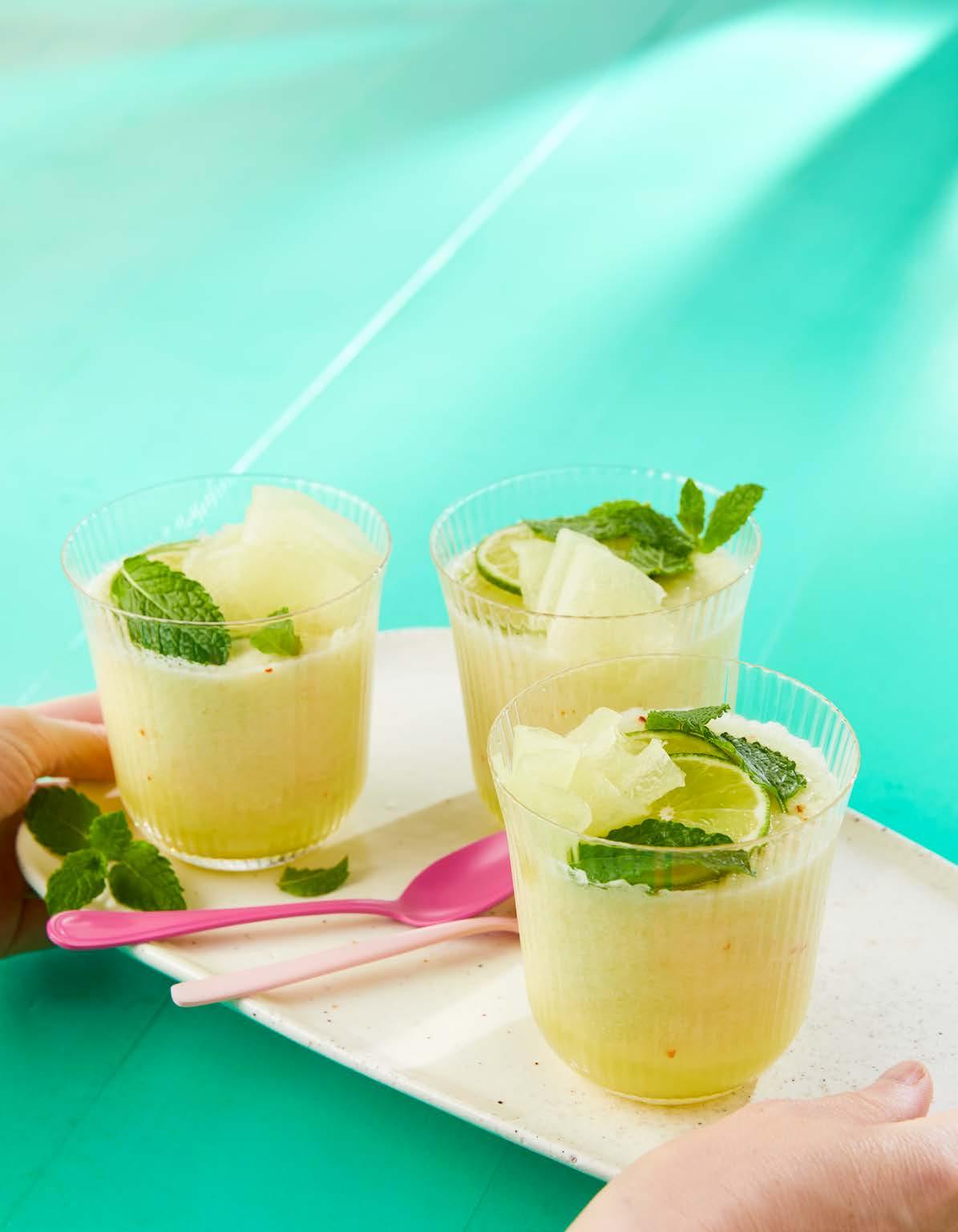 1 GALIAMELOEN (± 500 G) • 1 LIMOEN (BIO) • 12 BLAADJES MUNT