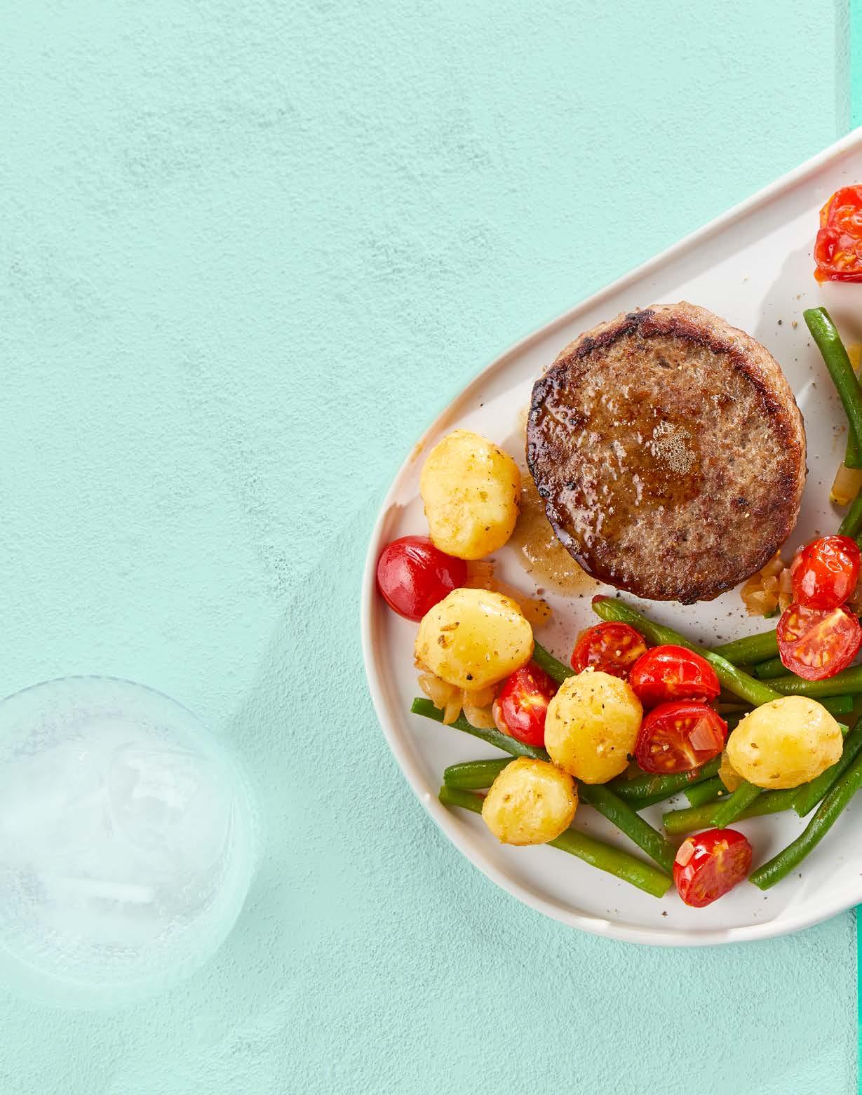 1 Breng een kookpot met lichtgezouten water aan de kook. Verwijder de uiteinden van de boontjes en kook 8 min. zonder deksel. Giet af, spoel onder koud water en laat uitlekken. 2 Snij de tomaatjes in 2. 3 Verhit 1/3 van de olijfolie in een pan met antiaanbaklaag en bak de aardappelen 10 min. 4 Verhit intussen 1/3 van de olijfolie in de kookpot van de bonen en stoof de ui glazig. Voeg de tomaatjes toe en laat 2 min. stoven. Voeg de boontjes toe en laat nog 5 min. stoven, kruid met peper en zout en roer om. 5 Verhit de rest van de olijfolie in een pan met antiaanbaklaag en bak de hamburgers ± 5 min. aan elke kant.