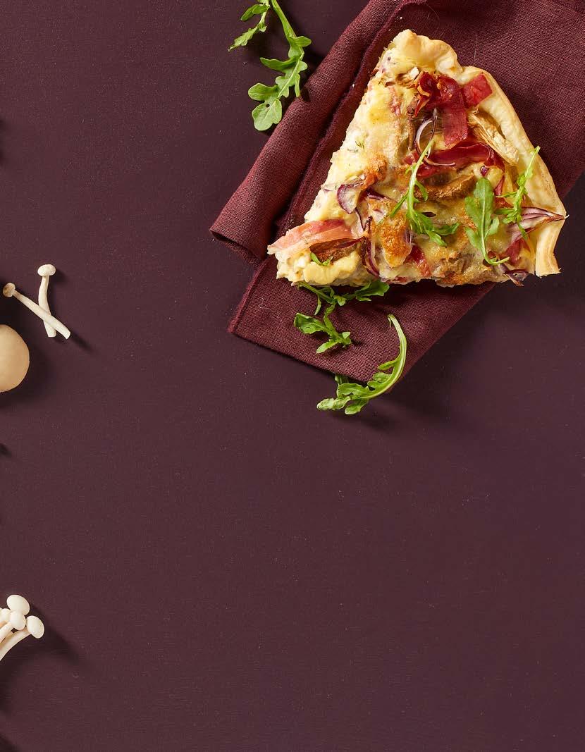 5 Répartissez le mélange sur la pâte feuilletée et garnissez avec l’oignon rouge, les pleurotes et le jambon Serrano. Glissez ± 50 min au four préchauffé à 180 °C. 6 Décorez de roquette.