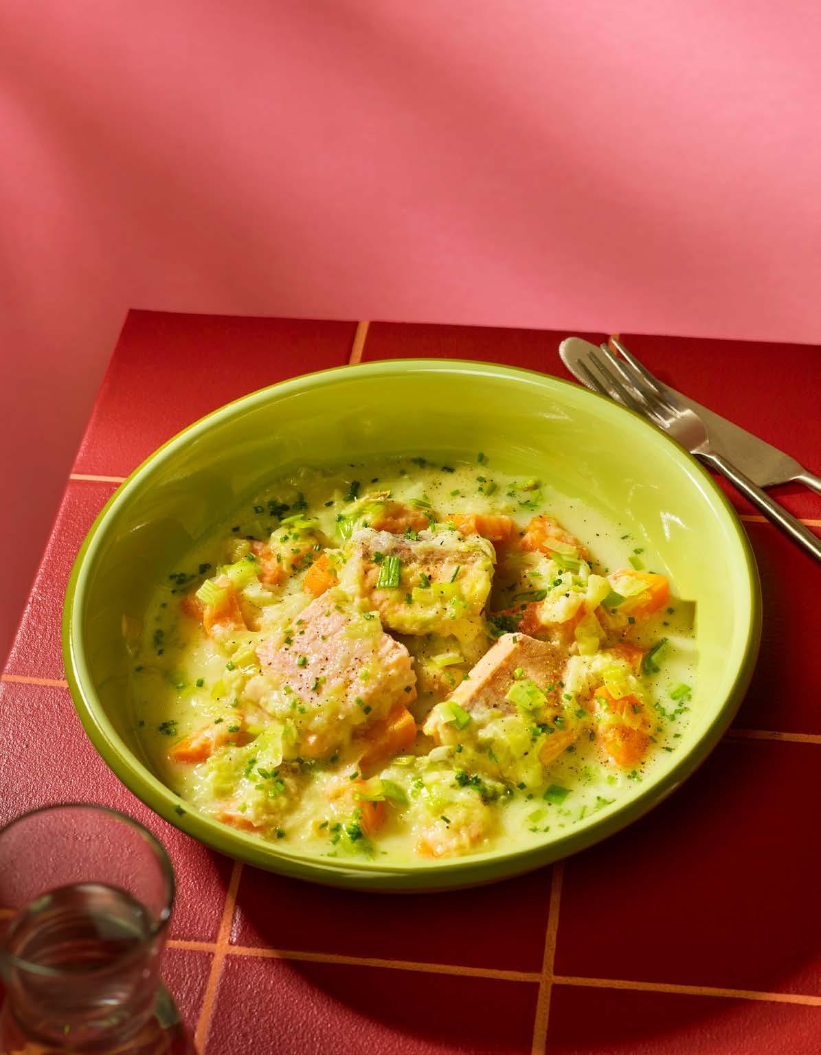 600 G DE FILET DE SAUMON ATLANTIQUE • 700 G DE POIREAUX À LA CRÈME (SURGELÉS) • 400 G DE CAROTTES
