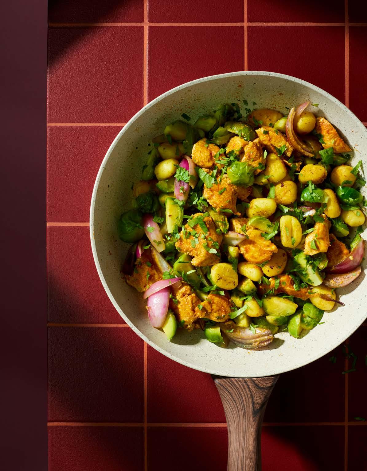 3 Faites chauffer 1 c. à soupe d’huile dans le wok et faites revenir les oignons rouges et les choux de Bruxelles 7 min. Réservez hors du wok. 4 Faites chauffer à nouveau 1 c. à soupe d’huile dans le wok et cuisez le poulet 5 min. Réservez hors du wok. 5 Faites chauffer le reste de l’huile dans le wok et faites revenir les gnocchis 4 min. Ajoutez le poulet et les légumes et laissez cuire 2 min. Salez et poivrez. 6 Ciselez la coriandre et garnissez-en le wok en fin de cuisson.
