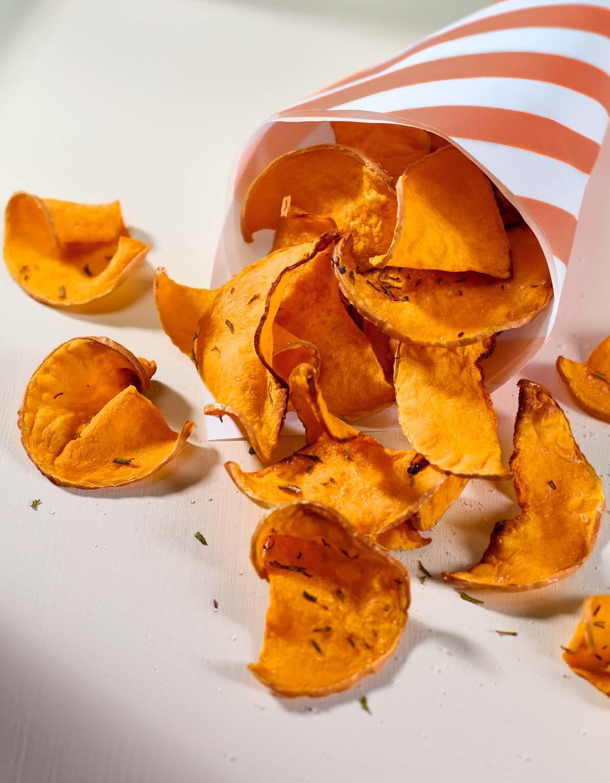 1 Coupez le potiron non pelé en très fines tranches de ± 2 mm (utilisez de préférence une mandoline ou un économe).