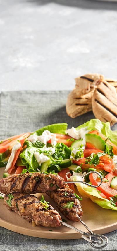 Préparez des keftas d’agneau épicées maison et servez-les avec une salade d’été à la burrata et une mayonnaise à la coriandre.