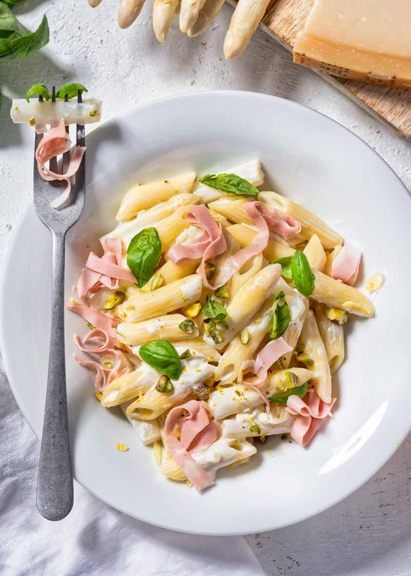 11 Penne met romige asperges, mortadella en pistache