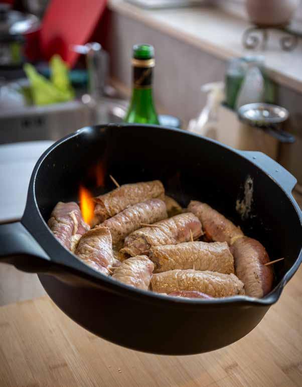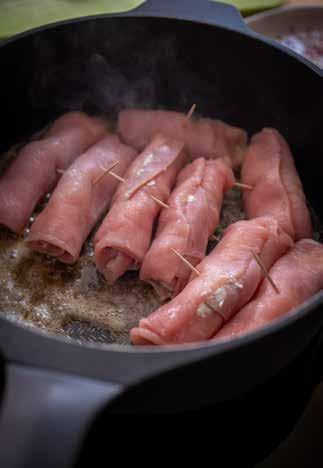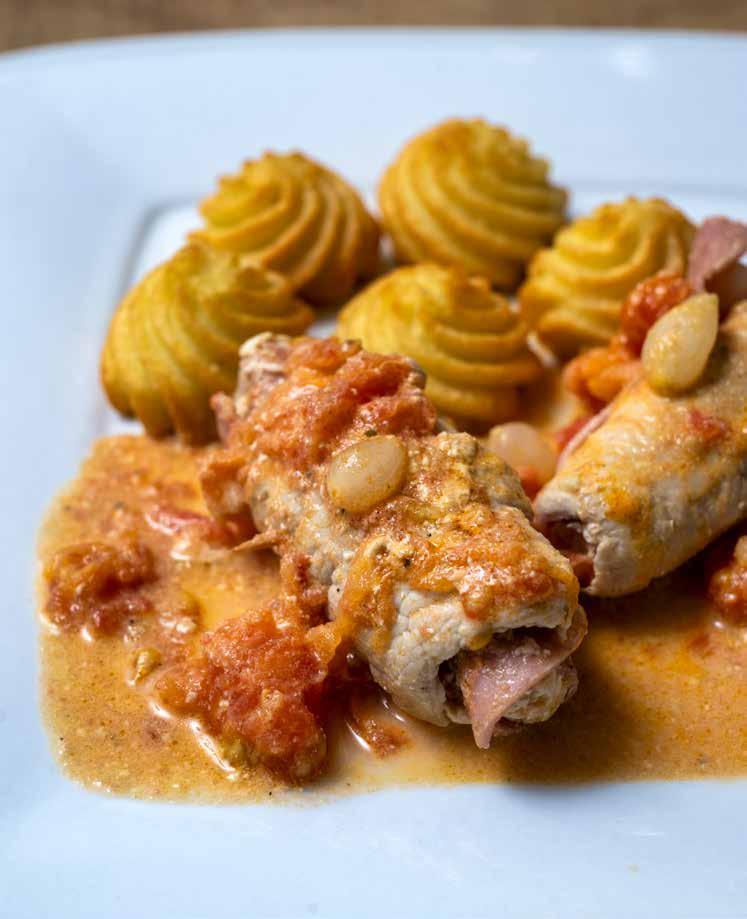 89 Varkensrolletjes met kruidenkaas en pommes dauphines