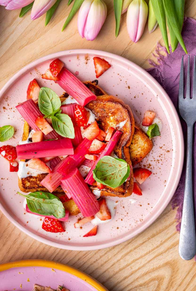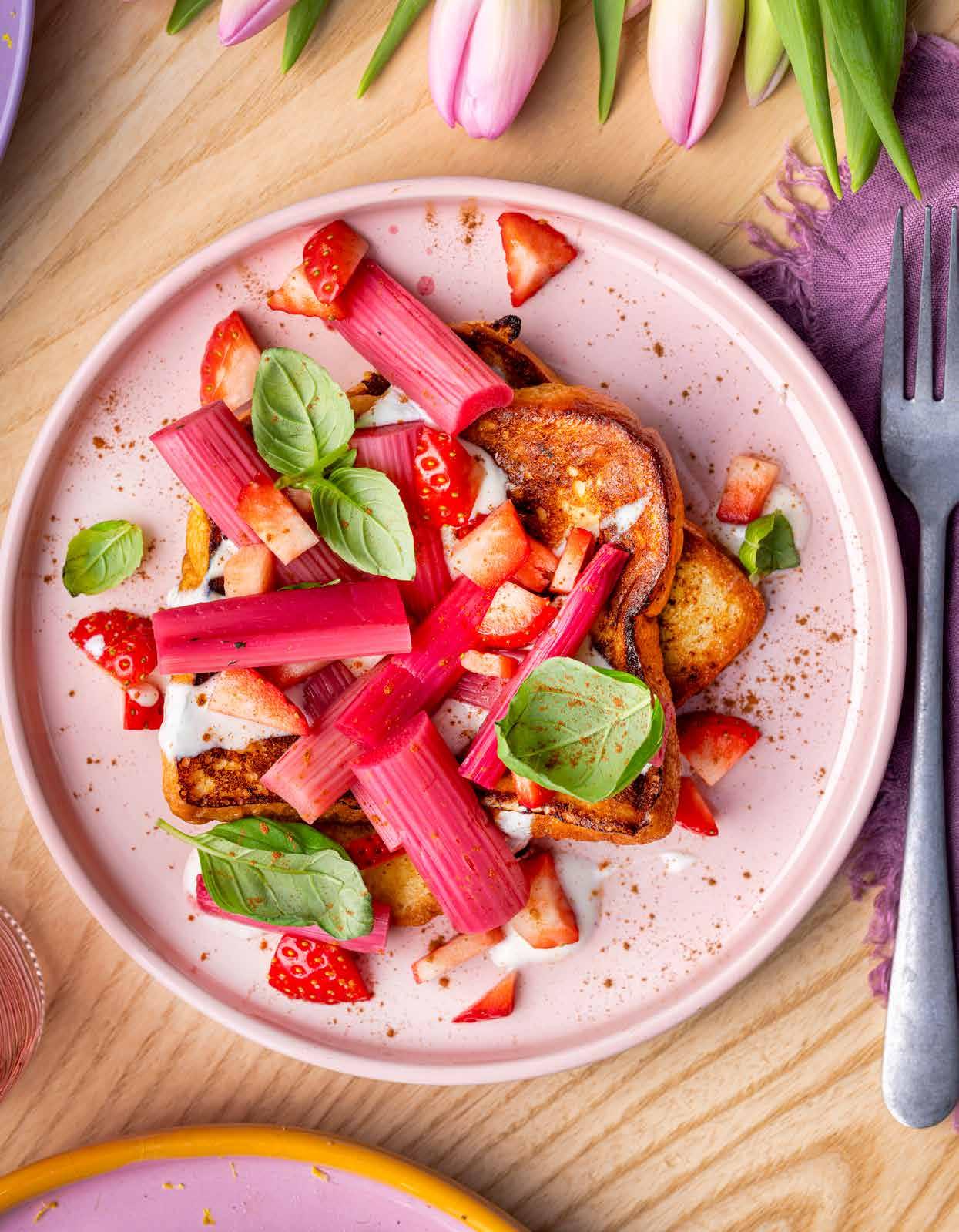 Een kleurrijke dag wordt het sowieso, als je die al begint met een ontbijtgerecht als dit. Het recept van deze French toast met vanille, rabarber en mascarpone vind je op p. 36