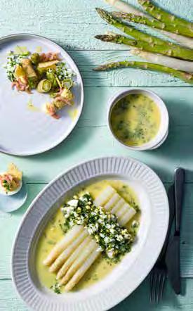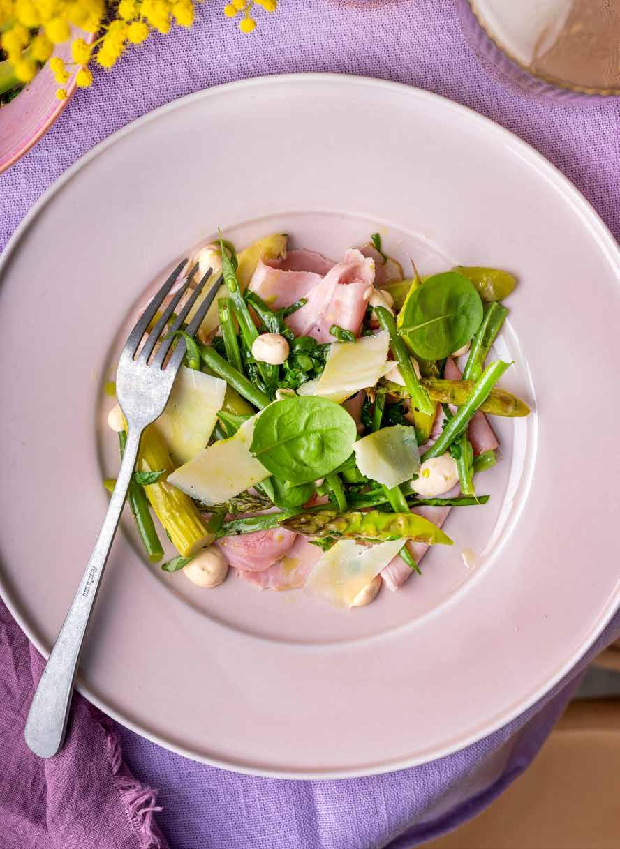 34 Salade van beenham met verse erwten, asperges, groene boontjes en spinazie