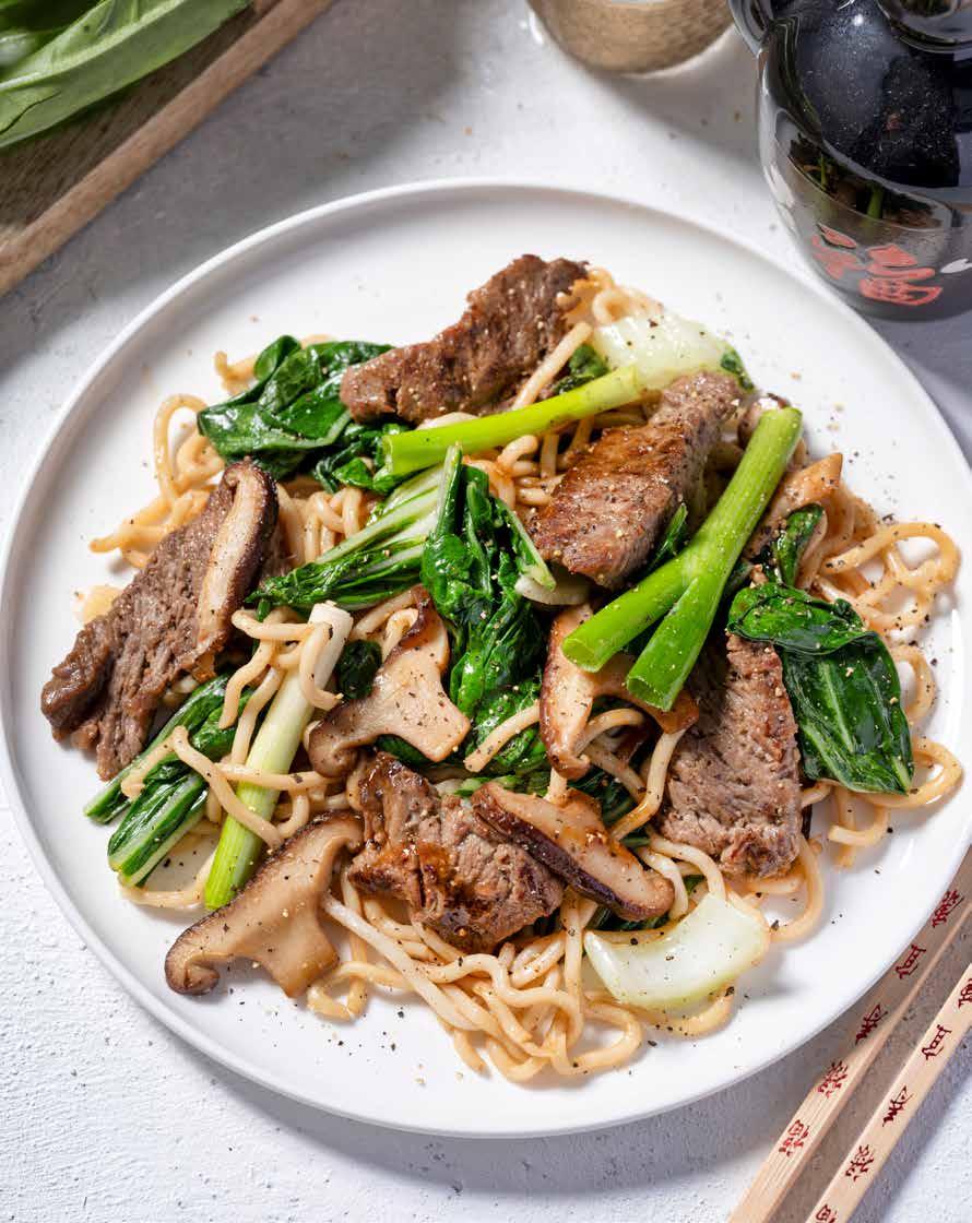 9 In de wok gebakken paksoi, biefstukplakjes en noedels