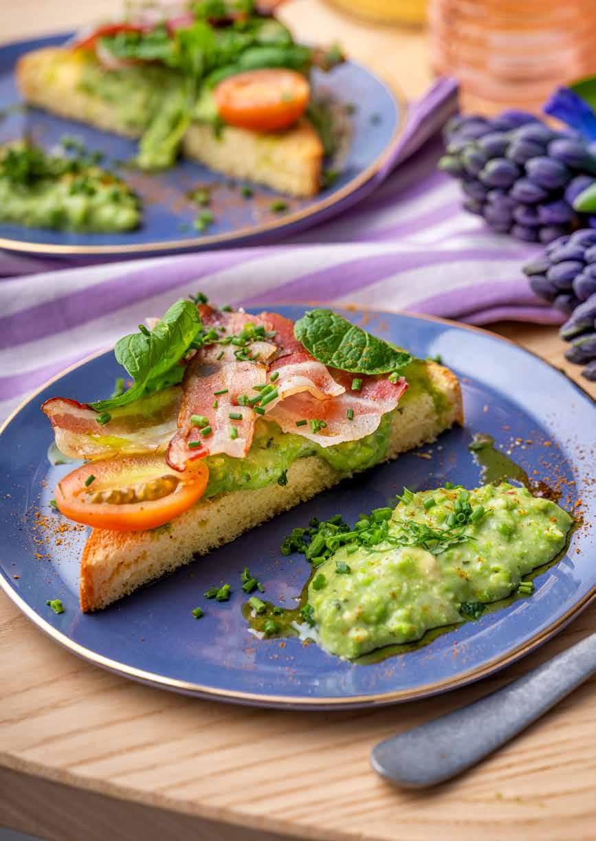 25 Avocado-erwtencrème met brioche, munt en gerookt spek
