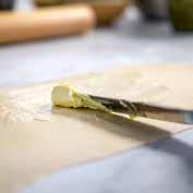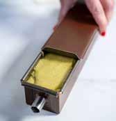 3. Travelcake: beboter en bebloem de travelcakevorm. Klop de eieren met de suiker los in een kom en voeg eerst de pistachepasta toe, vervolgens de gezeefde bloem met bakpoeder, de room, en als laatste de gesmolten boter.