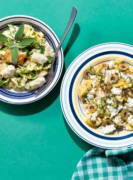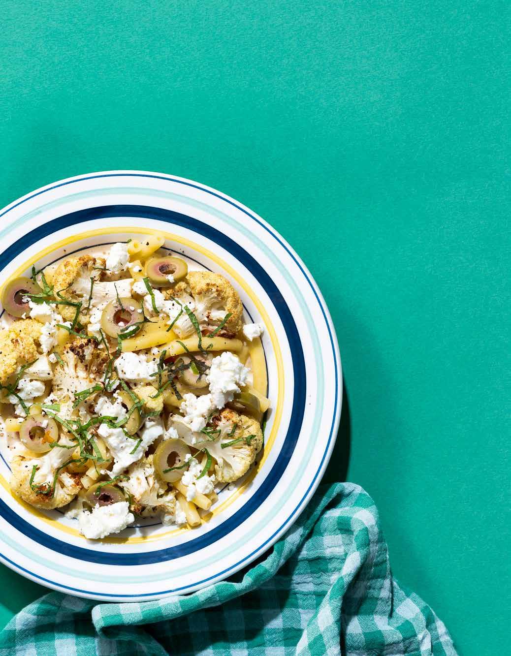 67 Macaroni met geroosterde bloemkool, groene olijven, feta en munt