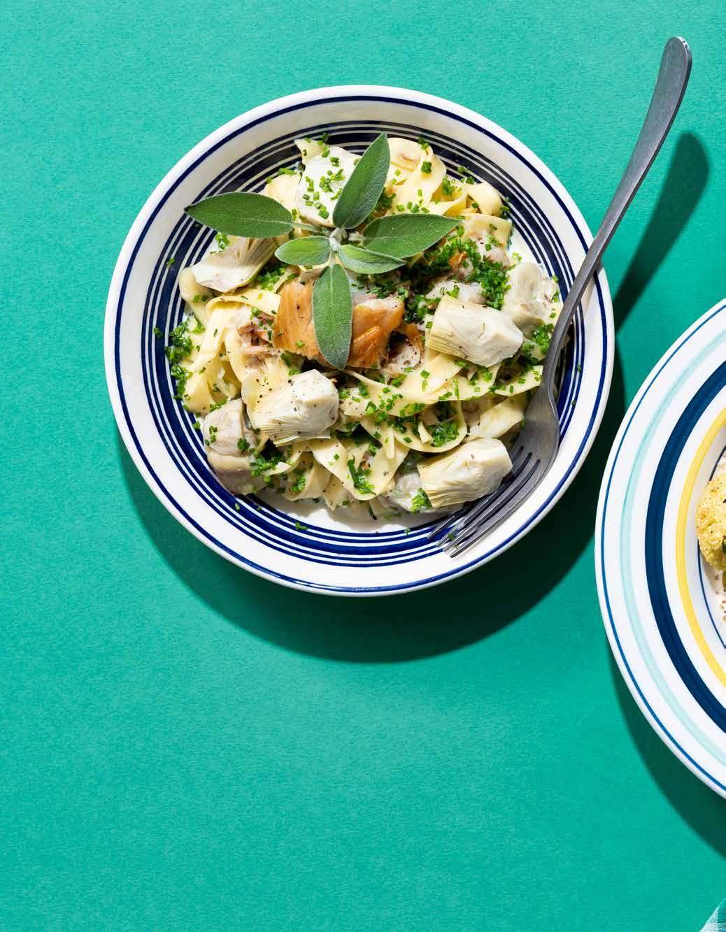 67 Pasta met artisjok, gerookte makreel, salie, look en kruiden