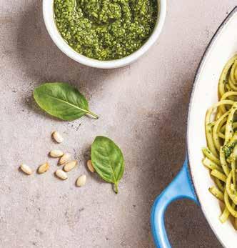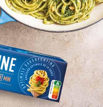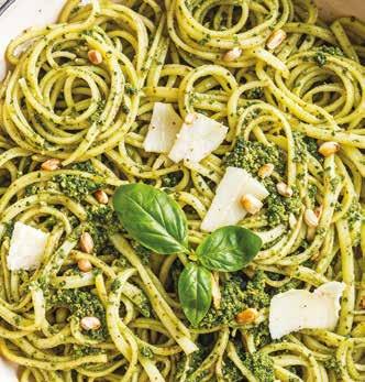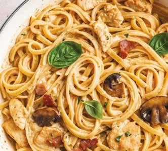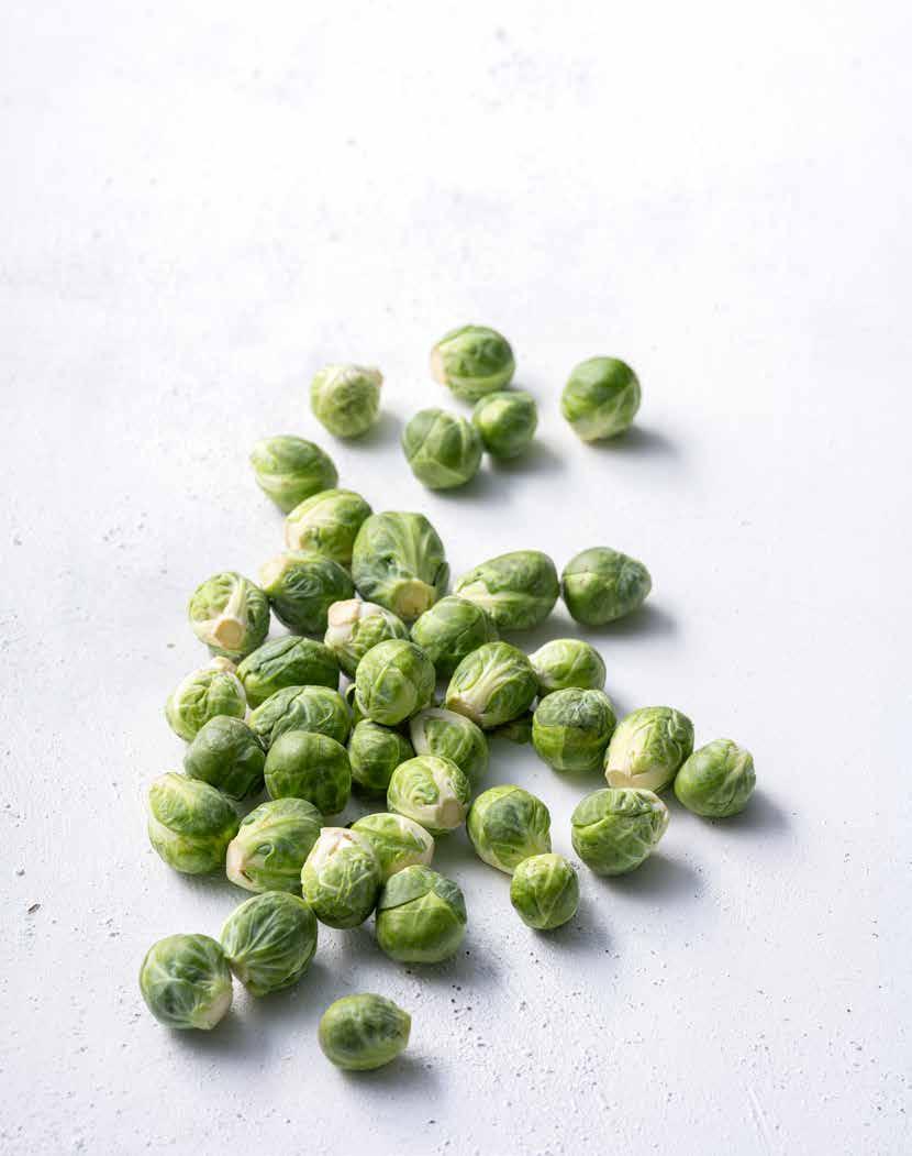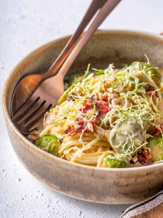 14 Spaghetti carbonara d’hiver aux choux de Bruxelles, lardons et noisettes