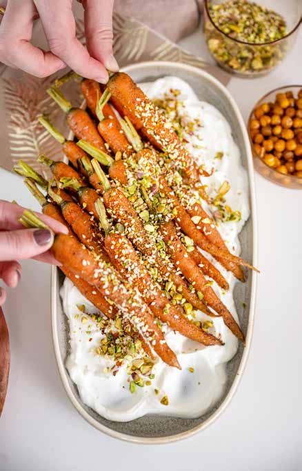 32 Petites carottes grillées au lebné, dukkah de pistache et pois chiches croquants