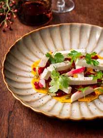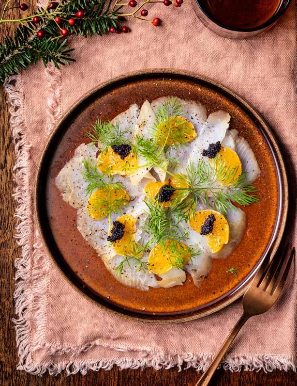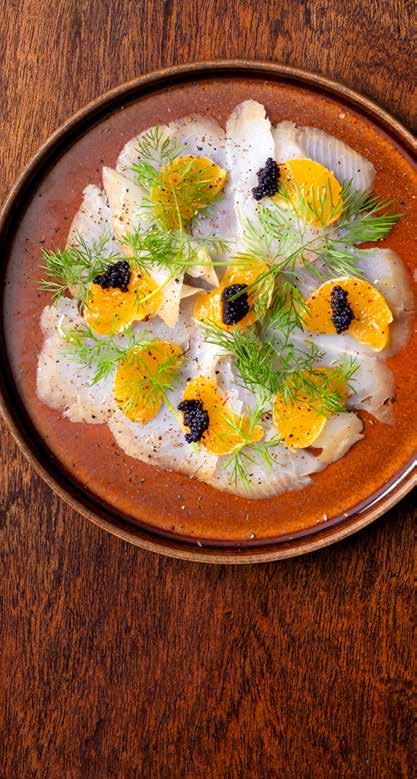 86 Carpaccio de flétan fumé, mandarines et œufs de lompe