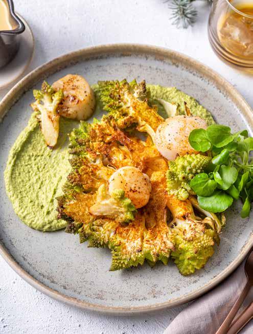 13 Steak de romanesco, coquilles Saint-Jacques, crème de petits pois et sauce au beurre et safran